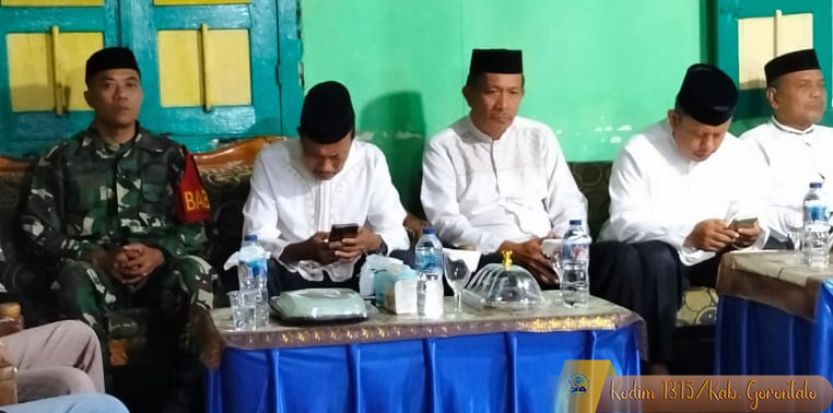 Anggota Koramil 1315-03/Tabongo Sertu Abdul Muis dan Sertu Noldiyanto Puyo hadir dalam kegiatan Tausiyah Malam Doa Hari Ke-7 sebagai wujud penghormatan dan solidaritas atas wafatnya rekan seinstitusi, Almarhum Purnawirawan Pelda Abas Hasan.