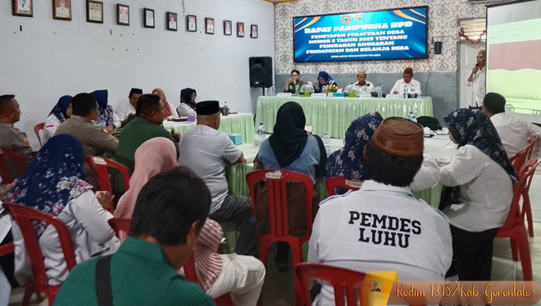 Telaga, 09 Juli 2025 – Koptu Herdi Hasan, Babinsa Koramil 1315-01/Telaga, menghadiri kegiatan Rapat Paripurna Penetapan Peraturan Desa tentang Perubahan Anggaran Pendapatan dan Belanja Desa (APBDes) Tahun Anggaran 2025 di Desa Luhu. Kegiatan tersebut digelar pada Rabu, 09 Juli 2025, pukul 10.00 Wita, bertempat di Kantor Desa Luhu, Kecamatan Telaga Biru, Kabupaten Gorontalo.