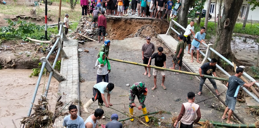 Jembatan yang selama ini menjadi penghubung utama aktivitas warga dari kedua dusun itu roboh setelah tiang penyangganya terkikis oleh derasnya aliran air sungai akibat intensitas hujan tinggi sejak pukul 14.00 Wita. Kejadian ini menjadi perhatian langsung dari Babinsa Koramil 01/Telaga, Sertu Jalil, yang langsung turun ke lokasi begitu menerima laporan dari masyarakat setempat.