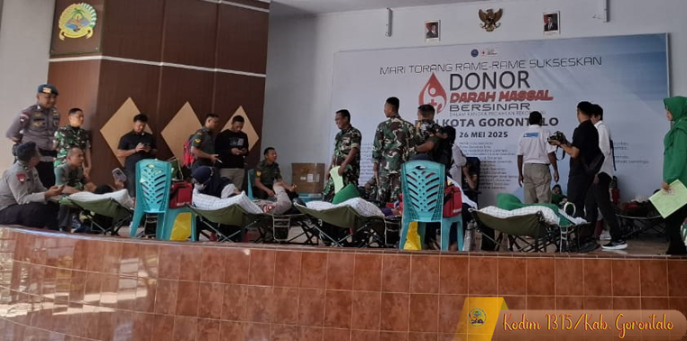 Gorontalo, 26 Mei 2025 - Sebanyak 60 orang anggota dan Persit dari Kodim 1315/Kabupaten Gorontalo ikut ambil bagian dalam kegiatan Donor Darah Massal yang digelar dalam rangka pemecahan Rekor MURI. Kegiatan ini berlangsung pada hari Senin, 26 Mei 2025 pukul 08.00 Wita bertempat di Aula Yonif 713/Satya Tama desa Tinelo Kecamatan Telaga Biru Kabupaten Gorontalo.