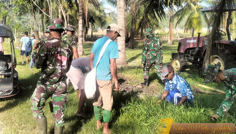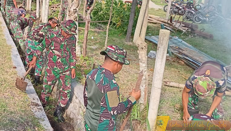 Kehadiran dalam kerja bhakti ini bukan sekadar formalitas. Selain Kapten Inf Tuju dan jajaran anggota Kodim 1315/Kab. Gorontalo, Kepala Desa Tabongo Barat, Haerudin Umar, pun turun langsung ke lapangan. Bukan dengan tangan kosong atau hanya berdiri memberi instruksi, melainkan turut memegang alat kerja, menyingsingkan lengan baju, dan bekerja bersama warganya.