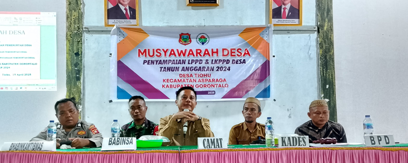 Asparaga, 15 April 2025 - Bertempat di Aula Kantor Desa Tiohu, Kecamatan Asparaga, Kabupaten Gorontalo, telah dilaksanakan Musyawarah Desa dalam rangka Laporan Penyelenggaraan Pemerintahan Desa (LPPD) Tahun Anggaran 2024. Kegiatan tersebut dimulai pukul 14.00 Wita. Dalam kegiatan tersebut hadir Camat Asparaga Mulyadi Passa, S.TP, Kepala Desa Tiohu Ramsing Lausupu, Bhabinkamtibmas Asparaga Brigadir Salim Totamu, serta Babinsa Asparaga Koramil 1315-05/Boliyohuto Serda Wandoli. Selain itu, hadir pula Ketua BPD Ronal beserta anggota, perangkat desa, tokoh agama, tokoh pemuda, anggota Linmas, LPM, dan masyarakat Desa Tiohu.