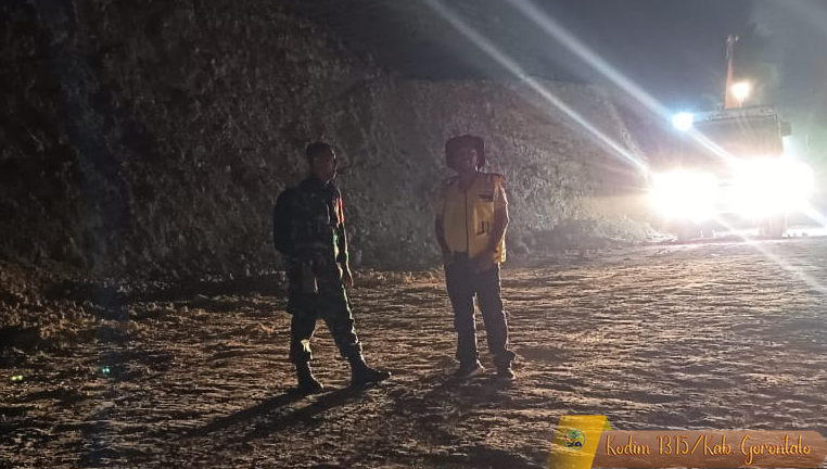 Tibawa, 04 Agustus 2025 – Sisa-sisa keganasan alam masih membekas di jalan GORR Desa Isimu Utara, Kecamatan Tibawa, Kabupaten Gorontalo. Di sana, malam tak hanya membawa gelap, tapi juga tekad dan tanggung jawab. Tepat pukul 19.00 Wita, Senin malam itu, Anggota Babinsa Koramil 1315-04/Tibawa terlihat berjaga di lokasi longsor. Mereka tak hanya hadir sebagai pengamat, melainkan sebagai garda terdepan yang ikut mendampingi sekaligus mengamankan jalannya proses pembersihan material longsor yang menutupi ruas jalan sepanjang lebih dari 100 meter.