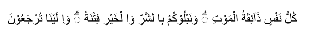 Artinya: “Setiap yang bernyawa akan merasakan mati. Kami akan menguji kamu dengan keburukan dan kebaikan sebagai cobaan. Dan kamu akan dikembalikan hanya kepada Kami.”