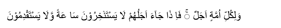Artinya: “Dan setiap umat mempunyai ajal. Apabila ajalnya tiba, mereka tidak dapat menundanya sesaat pun dan tidak dapat memajukannya.”