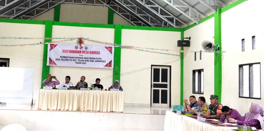 Musyawarah Desa Khusus Pembentukan Koperasi Merah Putih tingkat desa Talumelito Kecamatan Telaga Biru Kabupaten Gorontalo telah sukses dilaksanakan dan menghasilkan struktur pengurus serta langkah konkret menuju penguatan ekonomi desa melalui koperasi.