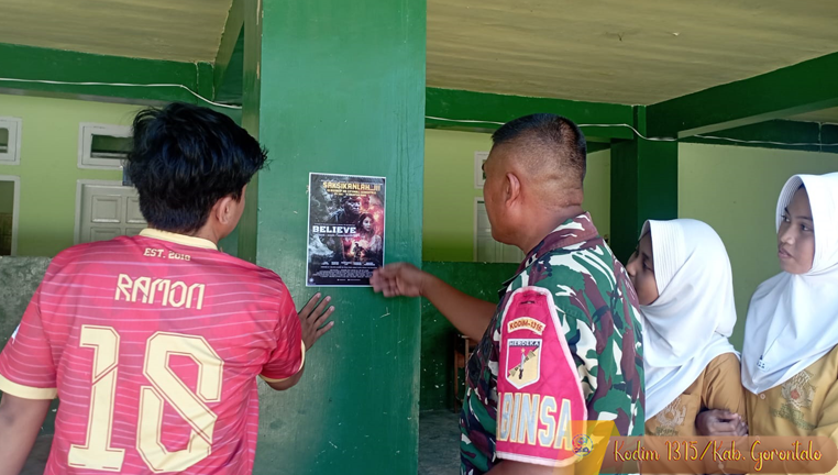 Wujudkan Generasi Cinta Tanah Air, Babinsa Telaga Pasang Stiker Believe di Dua Lembaga Pendidikan