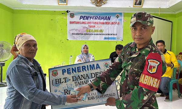 Gorontalo, 7 Mei 2025 - Babinsa Koramil 1315-05/Boliyohuto, Serka Laode Kalawara, turut serta mendampingi kegiatan penyaluran Bantuan Langsung Tunai Dana Desa (BLT-DD) Gelombang Ketiga Tahun 2024 yang dilaksanakan di . . . 0