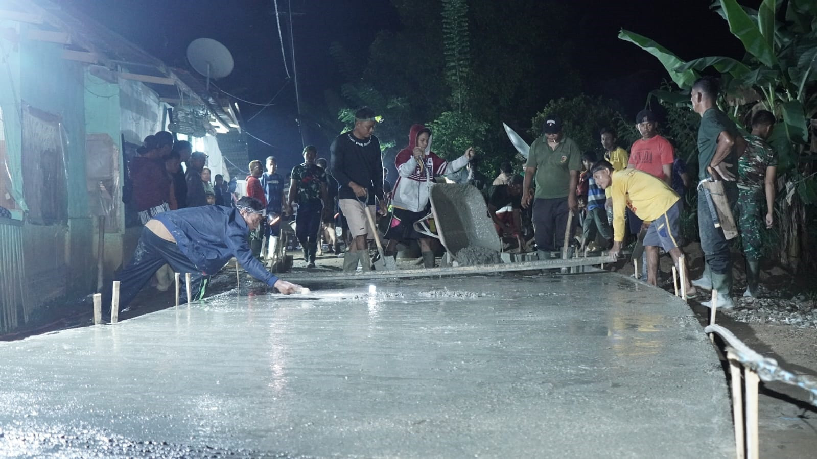 Lembur di Tengah Gelap Malam Satgas TMMD Kodim 1315 Kab Gorontalo Kejar Target Pengecoran Jalan Rabat Beton di Telaga Biru