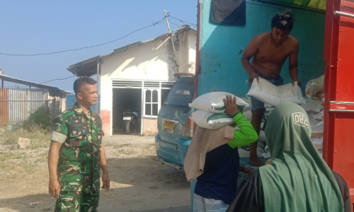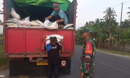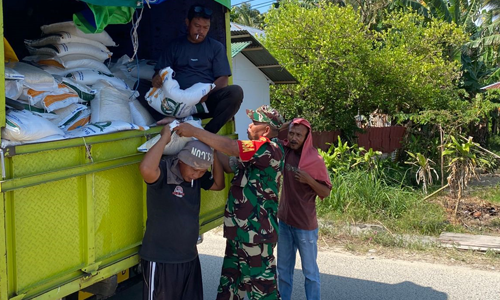 TNI Menyapa Desa, Kopda Dedy S. Rahim Kawal Pendistribusian Beras Bulog untuk Warga Payunga
