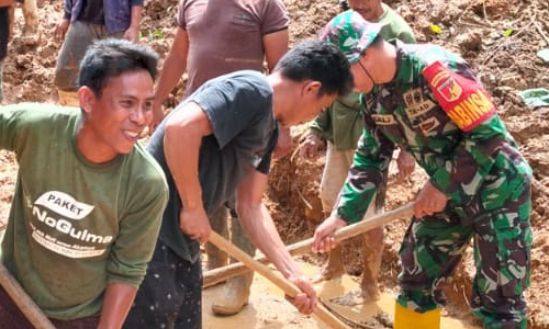 Sertu Jalil Bersama Aparat Pemerintah dan Masyarakat Bersihkan Jalan Tertimbun Longsor Di Talumelito